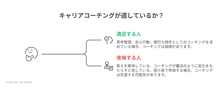 ここまで見てきたように、キャリアコーチングは役に立つ人には役に立ちますが、全員に必要なものではありません。受ければ安心、受ければ正解、というものでもありません。