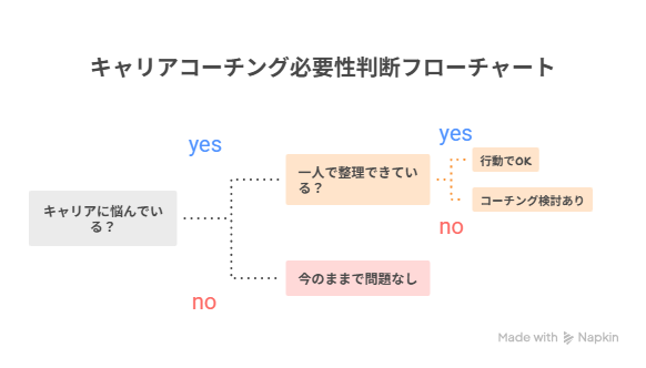 キャリアコーチングが必要かどうかは、「悩んでいるかどうか」ではなく、「一人で整理できず止まっているかどうか」で判断するとわかりやすいです。悩みがあっても自分で動けるなら、優先順位は高くありません。逆に、ずっと考えているのに何カ月も動けないなら、検討する価値はあります。