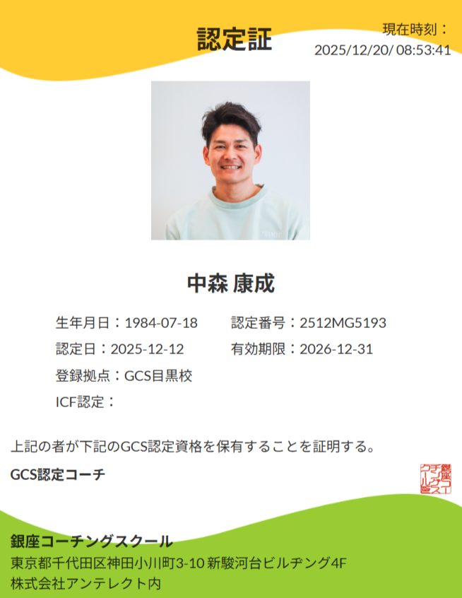 2025年から銀座コーチングスクールに通い、認定コーチとなりました。
